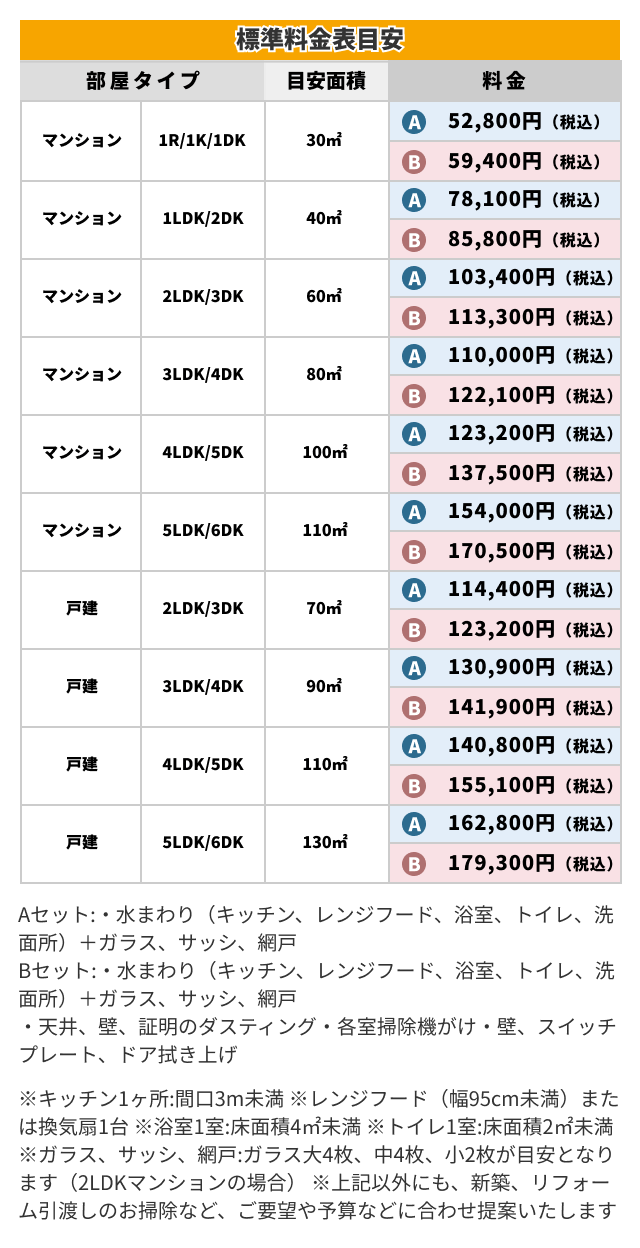 ※それぞれのお掃除箇所には対象条件がございます。詳しくは下記の料金表にてご確認ください。